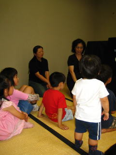 | <おさない子どものために>子ども19名大人13名 @おおきいまるちゃん、ちいさいまるちゃん(ペープサート) A大型絵本、「ぴょーん」 Bトントントントンひげじいさん(手遊び) C絵本「どこかな どこかな」 D「たまごのあかちゃん」パネルシアター <幼稚園児と小学生のために>子ども45名大人13名 @ぴょんちゃんの一日(しかけ絵本) A大型絵本「にじいろのさかな」 B新聞紙を使っておはなし(紙遊び) Cへそもち(パネルシアター) |